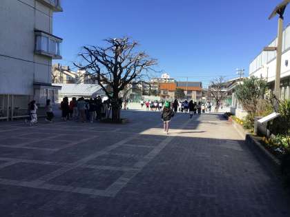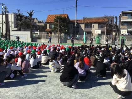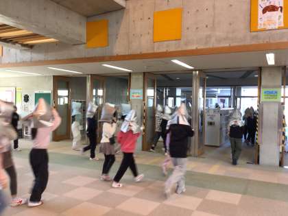 中休みの避難訓練だったため、子どもたちは教室や体育館、校庭等のそれぞれの遊び場から避難を行いましたが、避難訓練の放送が流れない中、教員の「家庭科室から火事です。校庭に避難します。」の声を聞き、ハンカチ等で口を押さえて速やかに避難する姿がみられました。