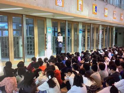 学年朝会で、「学年で身につけさせたい力」、「1月の生活目標」、「ありがとうの会」について話をしました。2年生の集大成として、「聞く力」と「つなげて考える力」を伸ばしていくとさらに大きく成長できるという話をしました。1月の生活目標では、あいさつ目標である「相手の名前を呼んであいさつしよう。」では、代表の友達が前に立ち、名前を呼んだ場合と呼ばない場合で、どちらが気持ちのよい挨拶かについて演技し、クイズを出しました。その演技を見て名前を呼んだ方が嬉しい気持ちになることを再確認することができました。最後に、3月4日には、保護者の方に「ありがとうの会」で、「できるようになったことの発表」を行うことを伝えました。学年みんなで協力していこうという気持ちをもつことができました。