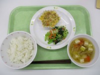 【今日の献立】・三色ピラフ・キャベツスープ・豆腐のナゲット・牛乳