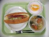 今日の給食は、セルフウインナーサンド、ベーコンと野菜のスープ煮、いよかん、牛乳で...