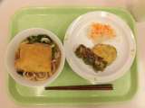 今日の給食は、もち入りきつねうどん、ちくわの磯辺揚げ、さつまいもの天ぷら、紅白な...