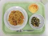 今日の給食は、スパゲティーナポリタン、牛乳、大根とひじきのサラダ、チーズケーキ、...