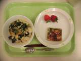 今日の給食は、クッパ、じゃがいもチヂミ、いちご、牛乳です。 今日のいちごは「とよ...