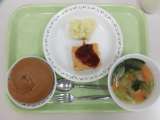 今日の給食は、ココアパン、ヘルシーミートローフ、じゃがいものクリームあえ、野菜ス...