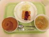 今日の給食は、あしたばパン、ヘルシーミートローフ、じゃがいものクリームあえ、キャ...
