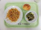 今日の給食は、スパゲティーナポリタン、大根とひじきのサラダ、チーズケーキ、牛乳で...