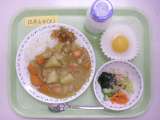 今日の給食は、チキンカレーライス・牛乳・福神漬け・和風サラダ・おかしな目玉焼きで...