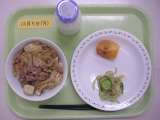 今日の給食は、豚丼・牛乳・きゃべつときゅうりのごま酢和え・フルーツ(柿)です。 ...