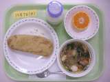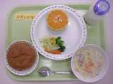 今日の給食は、ほうとう・牛乳・きゃべつの塩昆布かけ・小松菜ドーナツ・フルーツ(み...