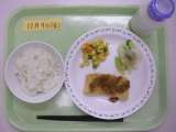 今日の給食は、ごはん・牛乳・魚のバーベキューソース・おひたし・きんぴらごぼう・み...