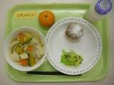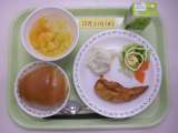 今日の給食は、バターロール・野菜ジュース・ささみのレモンソースかけ・じゃが芋のク...