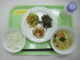 今日の給食は、ゆかりごはん・牛乳・鶏肉の唐揚げ・切り干し大根の卵焼き・炒めナムル...