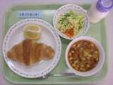 今日の給食は、クロワッサン・牛乳・ポークビーンズ・ミモザサラダ・フルーツ(はるか...