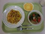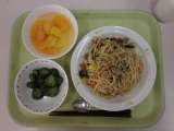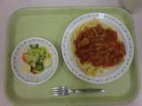 今日の給食は、スパゲティー地中海ソース、牛乳、ポテト入りフレンチサラダです。 ...