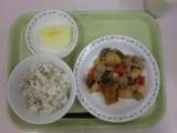 今日の給食は、子ぎつねごはん、牛乳、呉汁、きゃべつときゅうりのごま酢あえ、いよ...