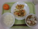 今日の給食は、ごはん、鮭のチャンチャン焼き、じゃが芋の甘辛煮、けんちん汁、みか...