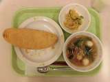 今日の給食は、あげパン(きな粉)、肉団子入り春雨スープ、白菜の中華サラダ、牛乳で...