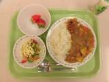 今日の給食は、チキンカレーライス、福神漬け、イタリアンサラダ、いちご、ジョアです...