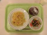 今日の給食は、ツナとキャベツのスパゲティー、小松菜のサラダ、チョコレートケーキ、...