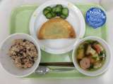 今日の給食は、お赤飯、ジャンボぎょうざ、きゅうりの甘酢かけ、すまし汁、バニラアイ...