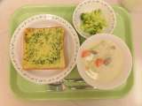 今日の給食は、ガーリックトースト、クリームシチュー、グリーンサラダ、牛乳です。 ...