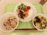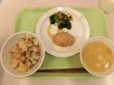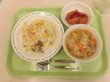 今日の給食は、コーンピラフ、豆腐のナゲット、白いんげん豆の田舎風スープ、牛乳です...