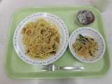 今日の給食は、海の幸の和風スパゲティー、ほうれん草サラダ、チョコレートケーキ、牛...