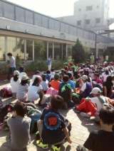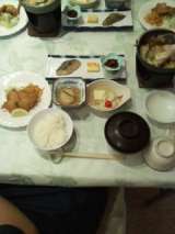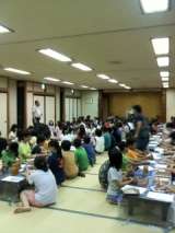 宿舎での初めての食事です。生活班でABCのグループをつくって、食べています。