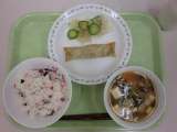 今日の給食は、梅わかごはん、牛乳、棒餃子、きゅうりと大根のごま風味、とうがんの...