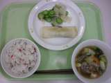 今日の給食は、梅わかごはん、牛乳、棒餃子、きゅうりと大根のごま風味、とうがんの中...