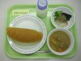今日の給食は、パンプキンパン・牛乳・カレーシチュー・じゃこサラダです。 じゃこサ...