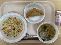 【今日の献立】 牛乳 チャーハン ジャンボぎょうざ 中華スープ【食材の産地】 米・・・宮城県 豚肉・・・群馬県 鶏肉・・・岩手県 鶏卵・・・群馬県 生わかめ・・・岩手県 玉ねぎ・・・北海道 人参・・・...