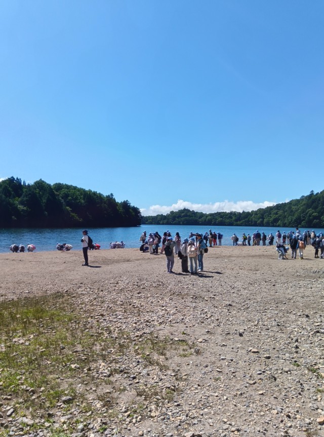 戦場ヶ原ではなく、湯の湖をながめながら、湖畔ハイキングに変更してスタートします。スタート前に湯ノ湖で休憩です。