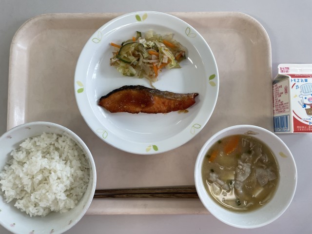 牛乳 ごはん 魚のステーキソース 梅ドレサラダ 僧兵汁