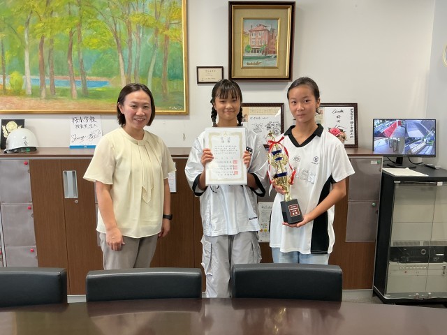 朝会後、校長室でサッカーの大会で優勝した6年生の表彰を行いました。