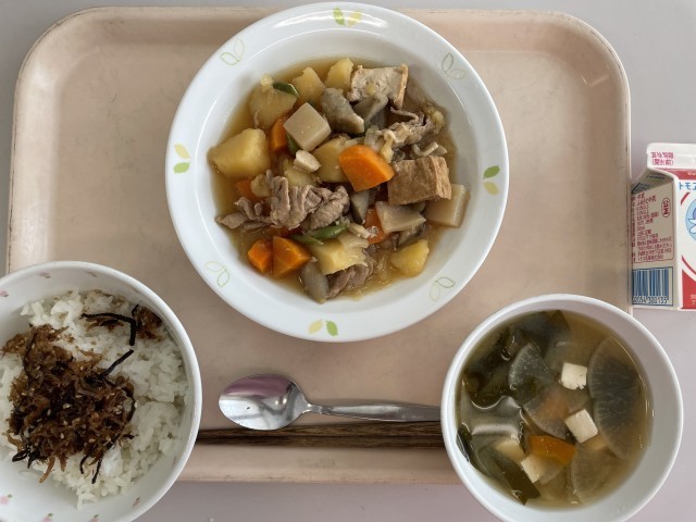 牛乳 ごはん かみかみふりかけ 五目旨煮 大根の味噌汁