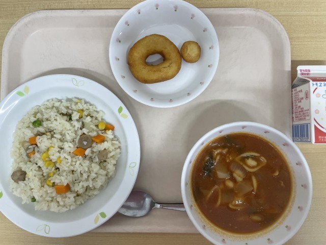 牛乳 三色ピラフ ミネストローネ ドーナツ