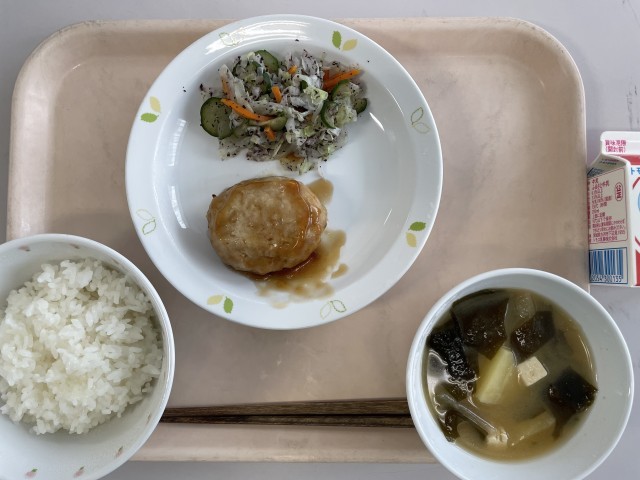 牛乳 ごはん 和風塩麹ハンバーグ 野菜のゆかりかけ じゃが芋の味噌汁