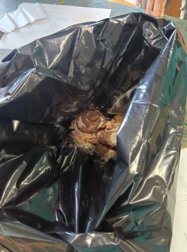 こちらは、災害時のトイレはどうしたらよいかの実験の様子です。災害用のトイレは用意していても実際に使ったことがない人がほとんどだということから、ニセモノのうんちやおしっこを作って、災害用の携帯トイレの秘密を研究しました。