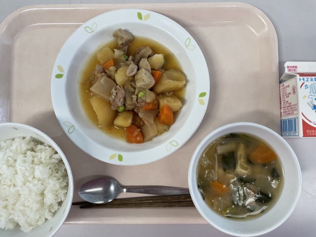 牛乳 ごはん じゃが芋と凍り豆腐の旨煮 油揚げと大根の味噌汁