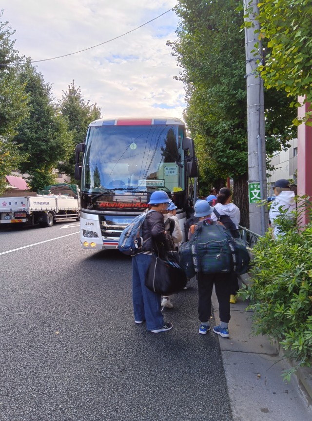 出発式を行い、バスに乗りました。3日間、仲間とともに協力しながら、楽しく過ごしてほしいです。安全第一で活動してまいります。