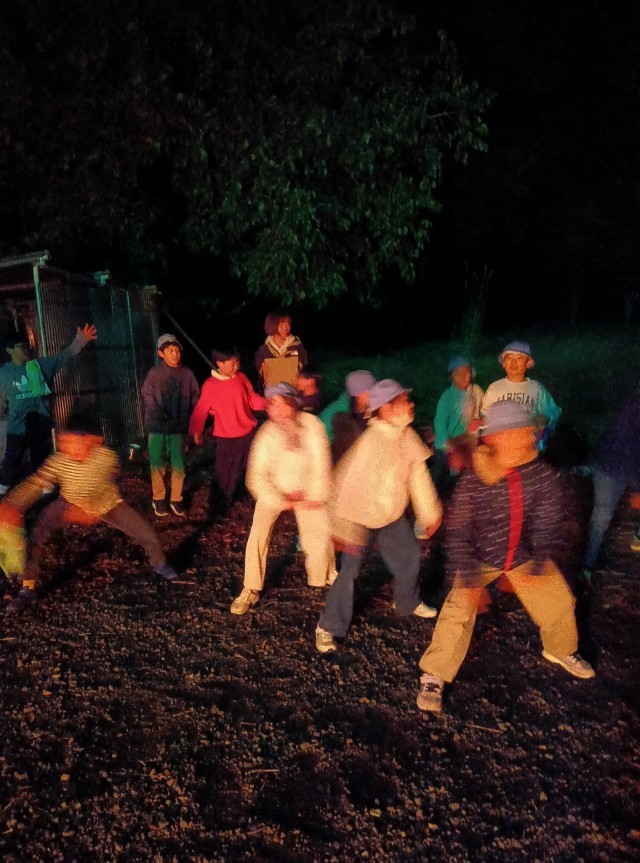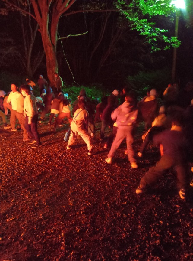火の子の点火式で炎が燃え上がり、ゲームやダンスで盛り上がりました。