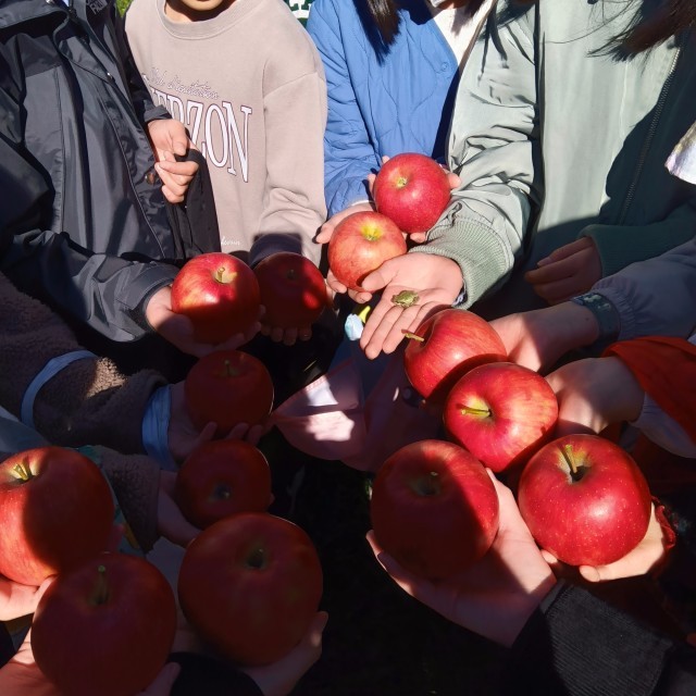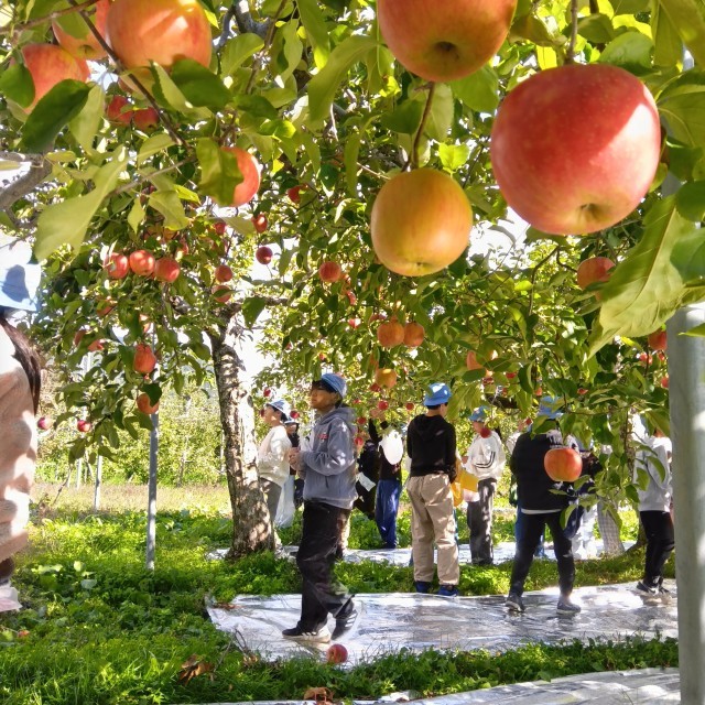到着後にりんごジュースを飲み、お楽しみのりんご狩り。