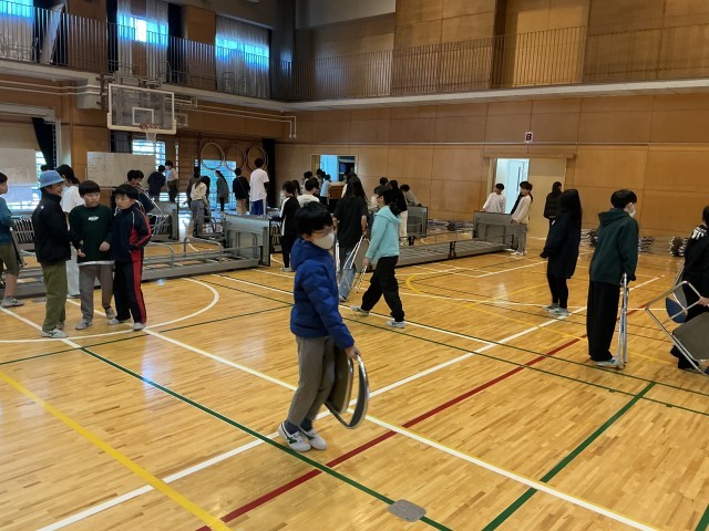 体育の学習用具を片付けたり、パイプ椅子を出したりと、進んで準備をしています。