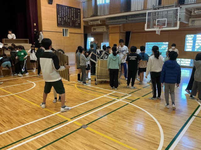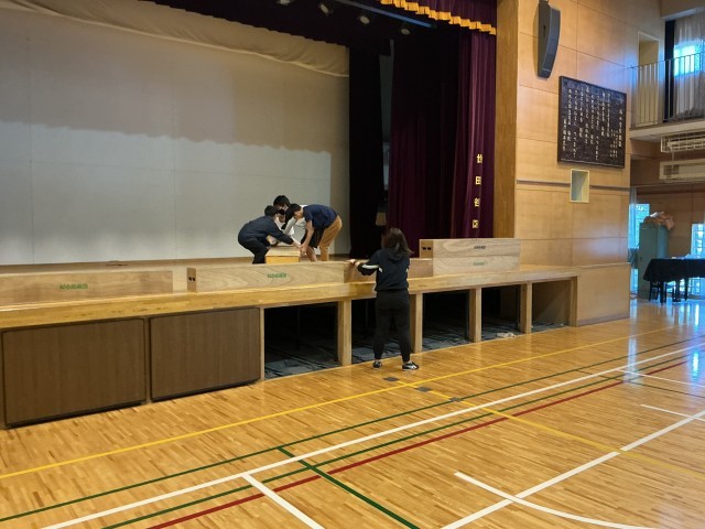 学芸会の練習開始に向けて、6年生が体育館の舞台準備をしています。
