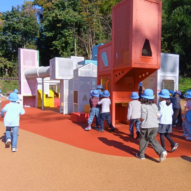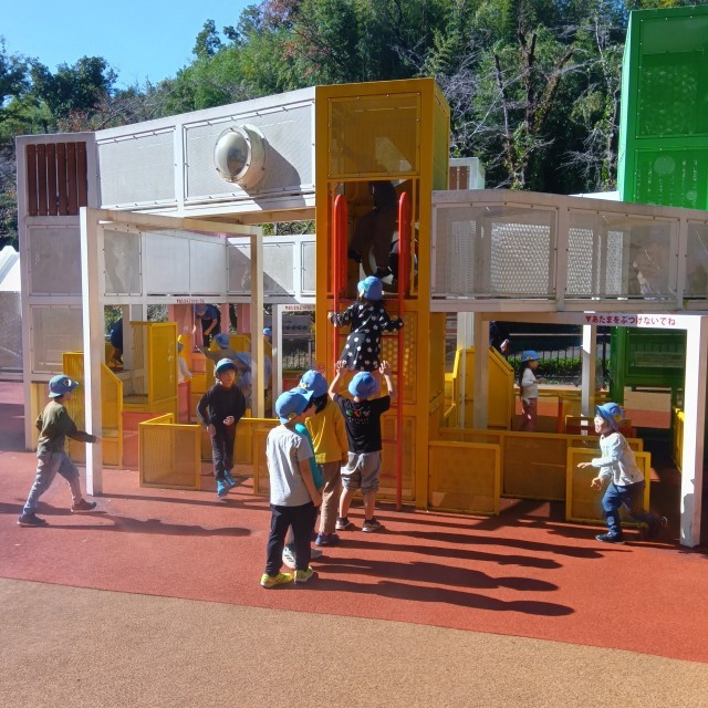 遊具で遊んだり、牛を見たり、みんな楽しんでいます。