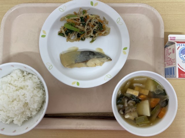 牛乳 ごはん 魚の西京焼き 野菜のごまだれかけ 田舎汁