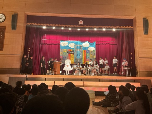 今回僕らが演じた6年生の作品『エルコスの願い』は、夢や希望笑うことさえ忘れてしまった子供たちの所に、ある日1台のロボットエルコスがやって来るお話です。エルコスのおかげで元気を取り戻していく子供たち。しかしただ1人エルコスを信じられない少年ジョンが、エルコスの動源力であるFZIに何か別の物を混ぜてしまい、エルコスは消滅しかけます。しかしエルコスは怒る所か、優しさや人を愛す心を教えて終わりました。ここで1つ思った事は、「本当の優しさって何だろう?」というテーマにちゃんと沿っていたので、そこに感動しました。演じた6年生にインタビューしたところ、「自分が犠牲になってでもジョンの罪を許した事が心に残ったと思いました。」と言ってくれました。最後に6年生の作品らしく、お客さんの心に響く作品でよかったなと思いました!