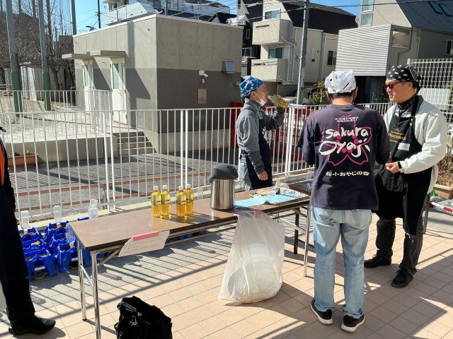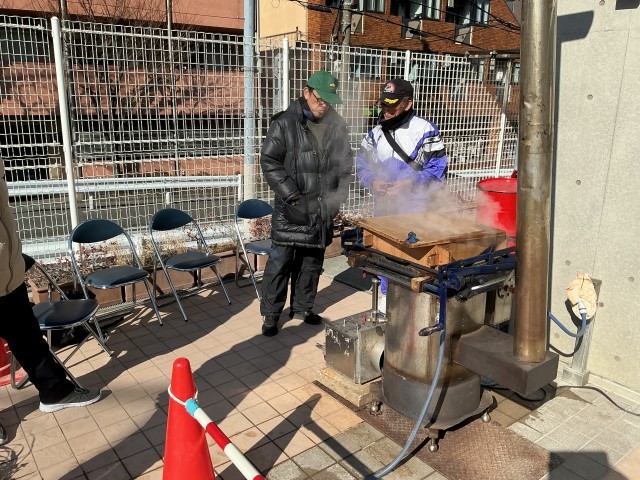 寒い中、外ではもち米をボイラーで蒸していただいています。
