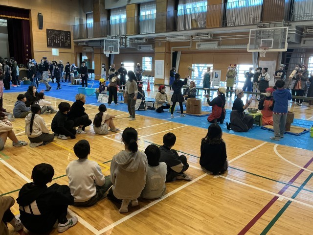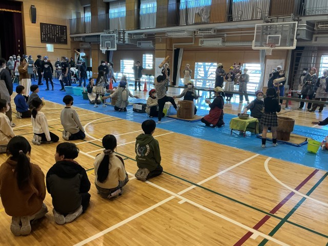 全部の学年の児童が、寒餅会での餅つきを楽しんでいました。